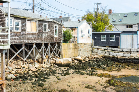 Rockport, Massachusetts, United States of America – September 20, 2016. Historic buildings along the Rockport Harbour in Rockport, MA. View during low tide.