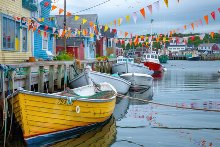 A serene harbor scene featuring fishing boats nestled against the dock, surrounded by colorful fishing gear, reflecting the essence of coastal life and maritime industry.