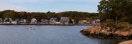 New Haven, Connecticut, United States - October 26, 2018: Panoramic view of residential homes on the Rocky Atlantic Ocean Coast during a cloudy day.
