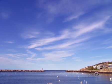 Fishing boats in the harbor on a sunny day In Rockport, Massachusetts.