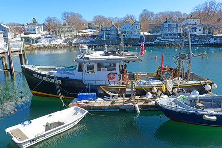 Fishing Boat at port of Rockport City in winter, Massachusetts, USA.