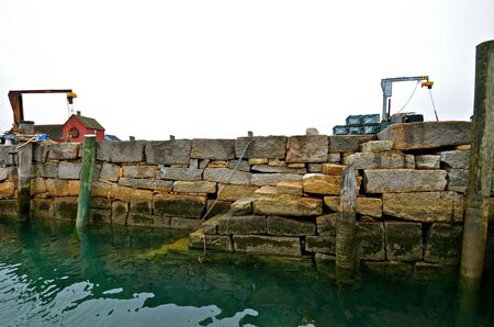 The retaining rock sea wall of rocks creates a patina and cats a reflection upon the waters in the harbor