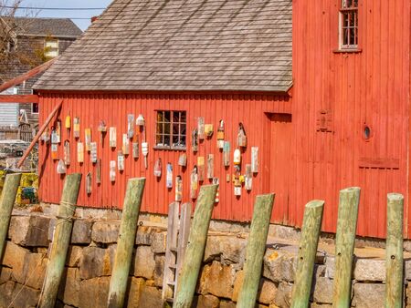 Motif #1, old red fishing shack in rockport massachusetts, world famous spot for artists and photographers, the rebuilt old red shack is at the end of a cement and stone dock, one wall is lined with buoys and a sea gull is perched on the chimney.