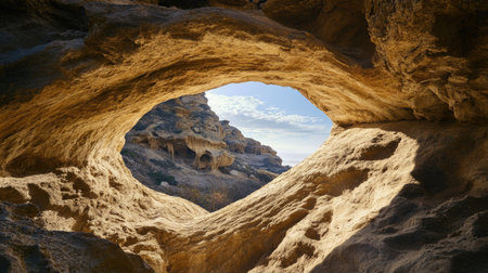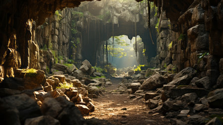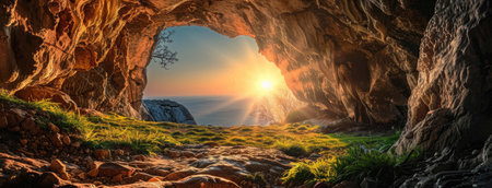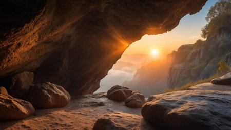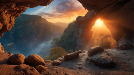 AI Generated. Stunning sunset view from cave entrance illuminating rocky landscape