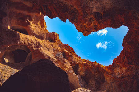 Heart shaped opening in caves of Algarve, Portugal, Europe view from popular boat cave tour along Algarve coast. Marinha Beach is one of the most beautiful beaches in the world.
