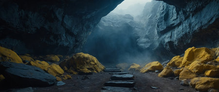 AI Generated. Blue and yellow smokey and foggy cave entrance Large stone cave Misty and foggy rock formation