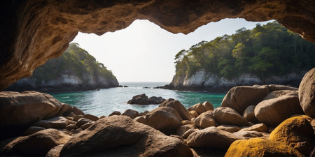 AI Generated. Natural forest scenery viewed from a shadowy coastal cave encircled by worn rock formations