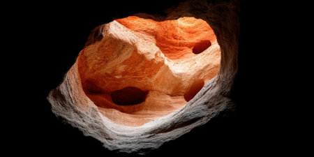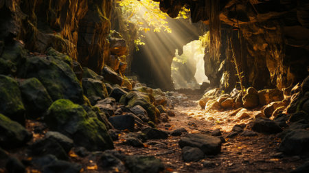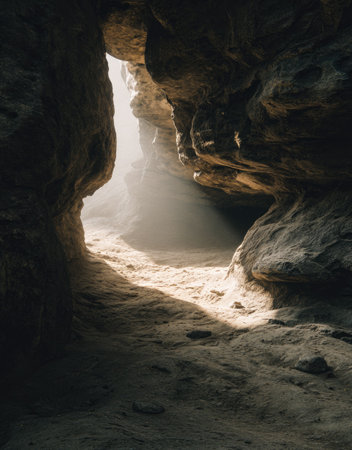 An image captures a cave entrance with sunlight pouring through, illuminating the textured rock formations. The composition emphasizes shadows and highlights, creating a dramatic visual contrast. Suitable for editorial purposes, the photograph presents a scene of natural beauty and light dynamics, suitable for a range of uses.