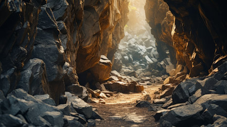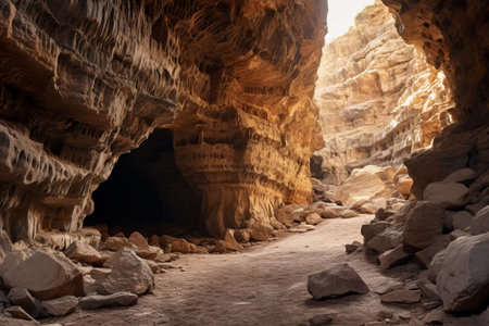 a boulder-strewn floor in a giant mountain cave, created with generative ai