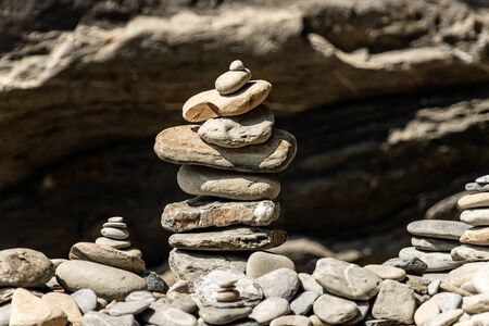 Close-up of a pile of stones in balance, Zen concept. Vernazza, Liguria, Italy