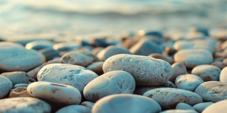 A serene scene of smooth pebbles on a beach during sunset, with warm light reflecting off the stones.