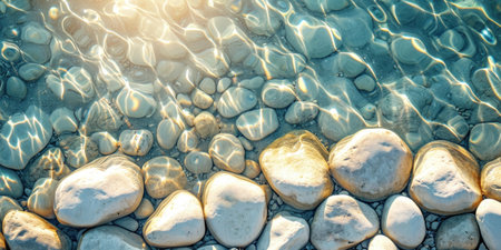 Vibrant close-up of smooth pebbles submerged in clear water, capturing the gentle waves and serene shoreline on a sunny day, perfect for nature lovers.