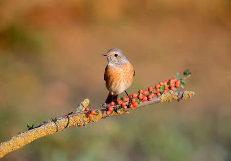 A common redstart female (Phoenicurus phoenicurus) sits on a black elderberry bush in the soft morning light. Close-up photo and easy identification of a bird in winter feather
