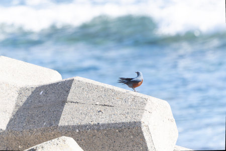 Male blue rock thrush on the tetra pot in the seaside.
