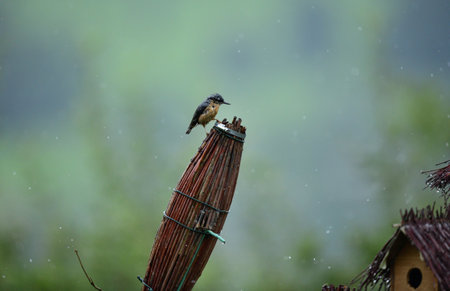 Eurasian Nuthatch sits on the spikes of a bird box during the rain