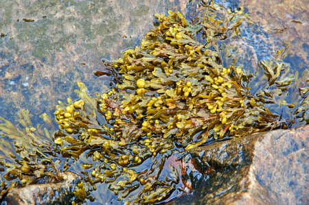 Bladder wrack seaweed (Fucus vesiculosus) growing on rocky shore and visible at low tide