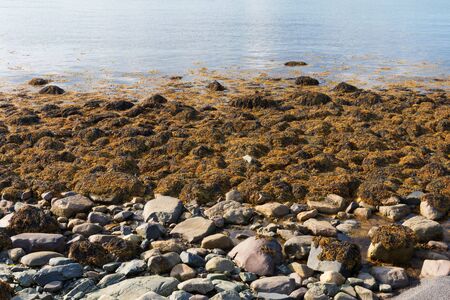 Seaweed on the beach of Atlantic ocean. Pebbles in the background. rea of Westfjords, Isafjordur, Iceland.
