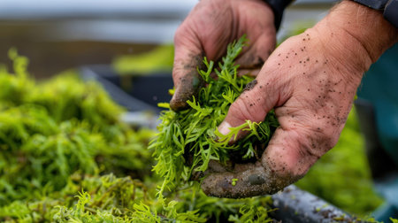 This image captures hands carefully harvesting fresh green seaweed, showcasing the textures and colors of marine life in a coastal environment.