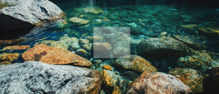 Crystal clear mountain stream filled with smooth rocks and vibrant water reflections