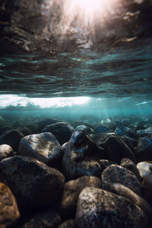 Underwater view with stones bottom, sun rays in water.
