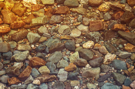 Multicolored stones underwater, background, texture. Dry round and soft river rocks. stones pebbles gravel natural. river stones