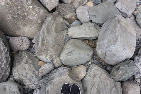 Looking at many different size pebbles stones and stylish woman sneakers from above. Multicolored outdoors horizontal image