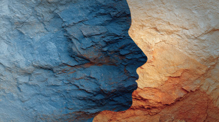 stone face in rock, rough texture, cliff against blue sky background, gradient