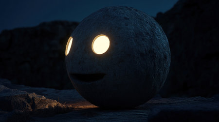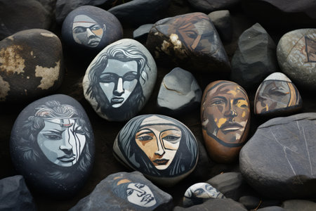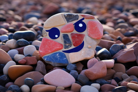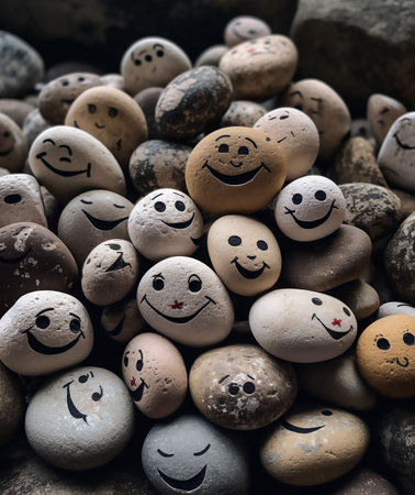 Encounter joy in simplicity with a close up of a stack of stones featuring a painted happy face against a nature background. A whimsical and Zen inspired concept.