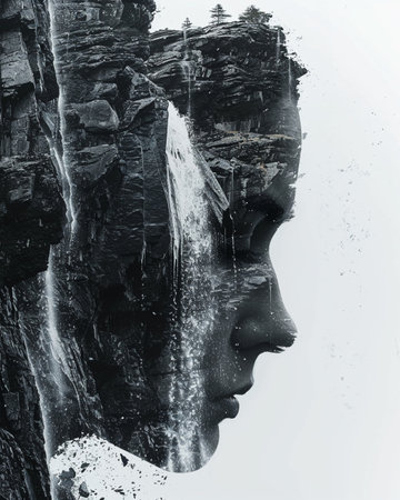 Mountain waterfall, close up, cascading water, Double exposure silhouette with rocks
