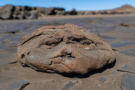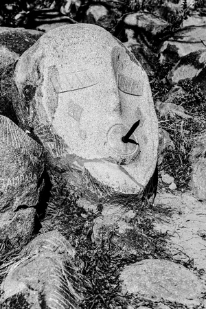 A rock sculpture resembling a face with a grim expression rests among colorful stones in a natural setting adding intrigue to the landscape.