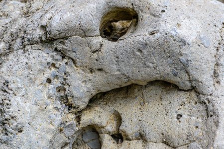 A detailed close-up captures the intricate texture of a weathered, dark stone, showcasing its rugged surface. The rock is surrounded by a collection of smaller pebbles, emphasizing the natural outdoor setting. This macro photography highlights geological detail, perfect for illustrating concepts of geology, earth science, or environmental design. The stone texture and contrasting elements make this image ideal for use in background elements, stone art projects, or educational materials about the environment.