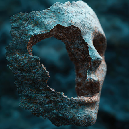 Cracked face in the clouds, representing fragility and emotional vulnerability.