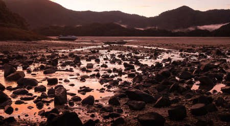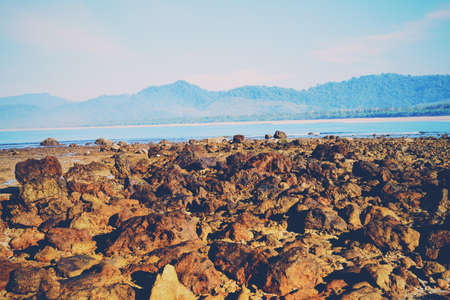 A stack of round stones standing on the shore of a sea Rocky coast at Khao Laem Ya Mu Ko Samet National Park Rayong, Thailand in sunset time