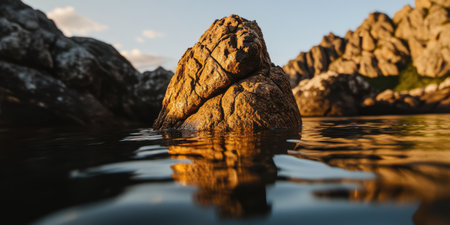Golden Rock Formation in Calm Water Peaceful Sunset Nature Scene sea sky day view rocks stone still