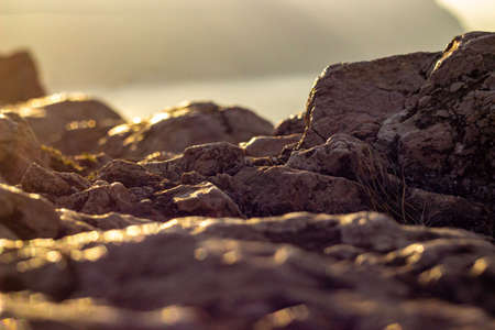 Rocks on the sea shore in the rays of the setting sun