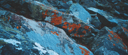 Colorful lichen patterns on textured rocks of arctic tundra displaying unique designs