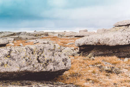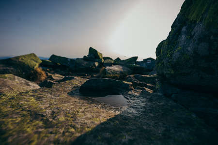 Close up of stones in highlands. Destroyed rock formations in mountainous area on sunny day.