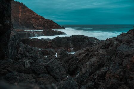 Long exposure shot of blue ocean waves creating a soft, misty effect as they break on the rocks