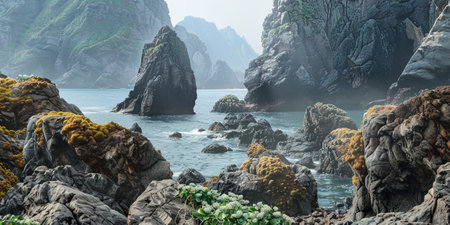 Foggy seascape with rocks and plants in the foreground