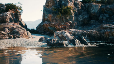 Sharp stones and rocks in the turquoise, blue sea. Beautiful seascape at long exposure. Aegean coast in Turkey at sunrise. Bodrum.