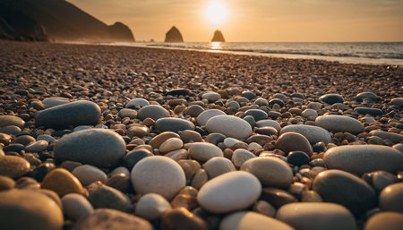 Colorful pebble stones on the beach at sunset in summer