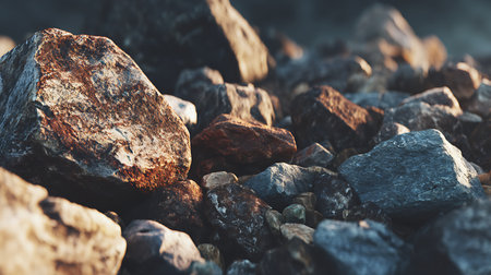 A detailed close-up captures the intricate texture of a weathered, dark stone, showcasing its rugged surface. The rock is surrounded by a collection of smaller pebbles, emphasizing the natural outdoor setting. This macro photography highlights geological detail, perfect for illustrating concepts of geology, earth science, or environmental design. The stone texture and contrasting elements make this image ideal for use in background elements, stone art projects, or educational materials about the environment.