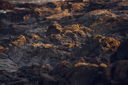 A closeup view of natural rocky formations on a volcanic beach, showcasing unique textures and colors against a dark sand backdrop. Perfect for nature themes.
