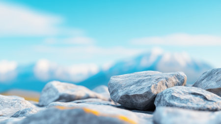 Smooth stones bask under a clear sky with distant mountains in soft focus, AI