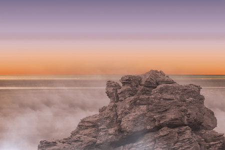 Rugged rock formation is emerging from calm sea in flat design, featuring misty waves, gradient sky. Coastal, landscape, minimalism, nature, tranquility, atmospheric, scenic