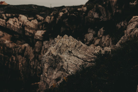 Rugged rock formation with dark vegetation under a cloudy sky. A dramatic landscape showcases a sharp, textured rock formation against a muted sky, with hints of greenery. Moody nature.