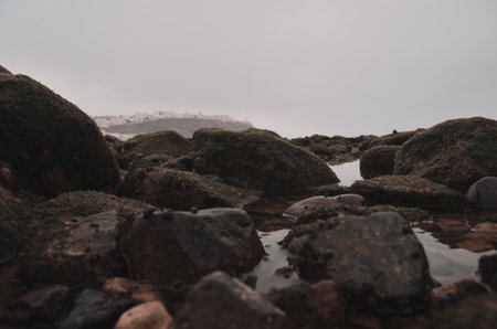 Stones covered with algae on the coastline of Atlantic Ocean
