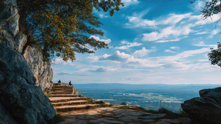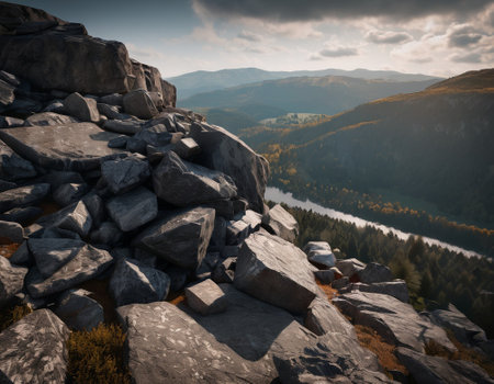 An AI generated illustration of a hilltop landscape of a rocky terrain and clouds in the sky