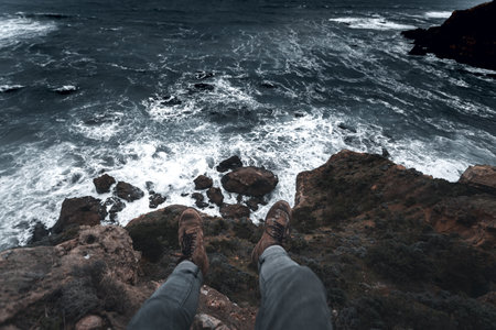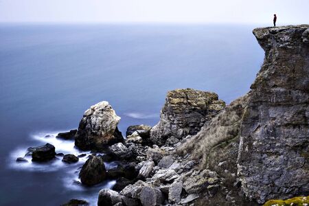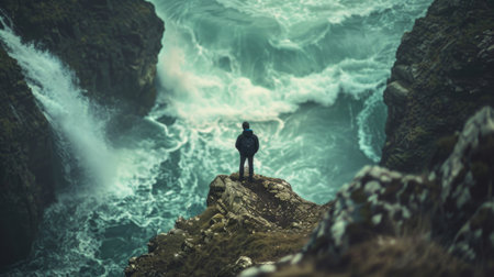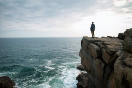 Hiker standing on a cliff overlooking the ocean enjoying freedom and solitude, contemplating the immensity of nature