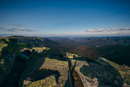 A male feet sitting on the rock against forest mountains with bright green and orange autumn trees